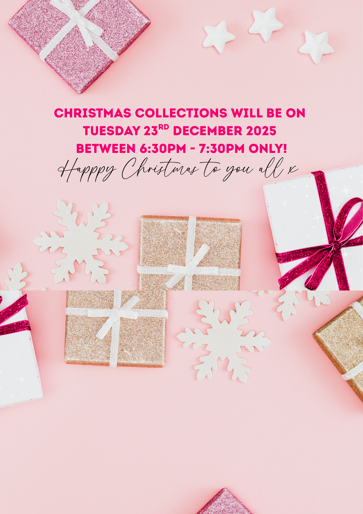 Boxes will be ready to collect on TUESDAY 23RD DECEMBER between 6:30PM- 7:30pm ONLY! please do not book if these timings do not work for you.